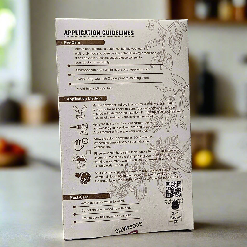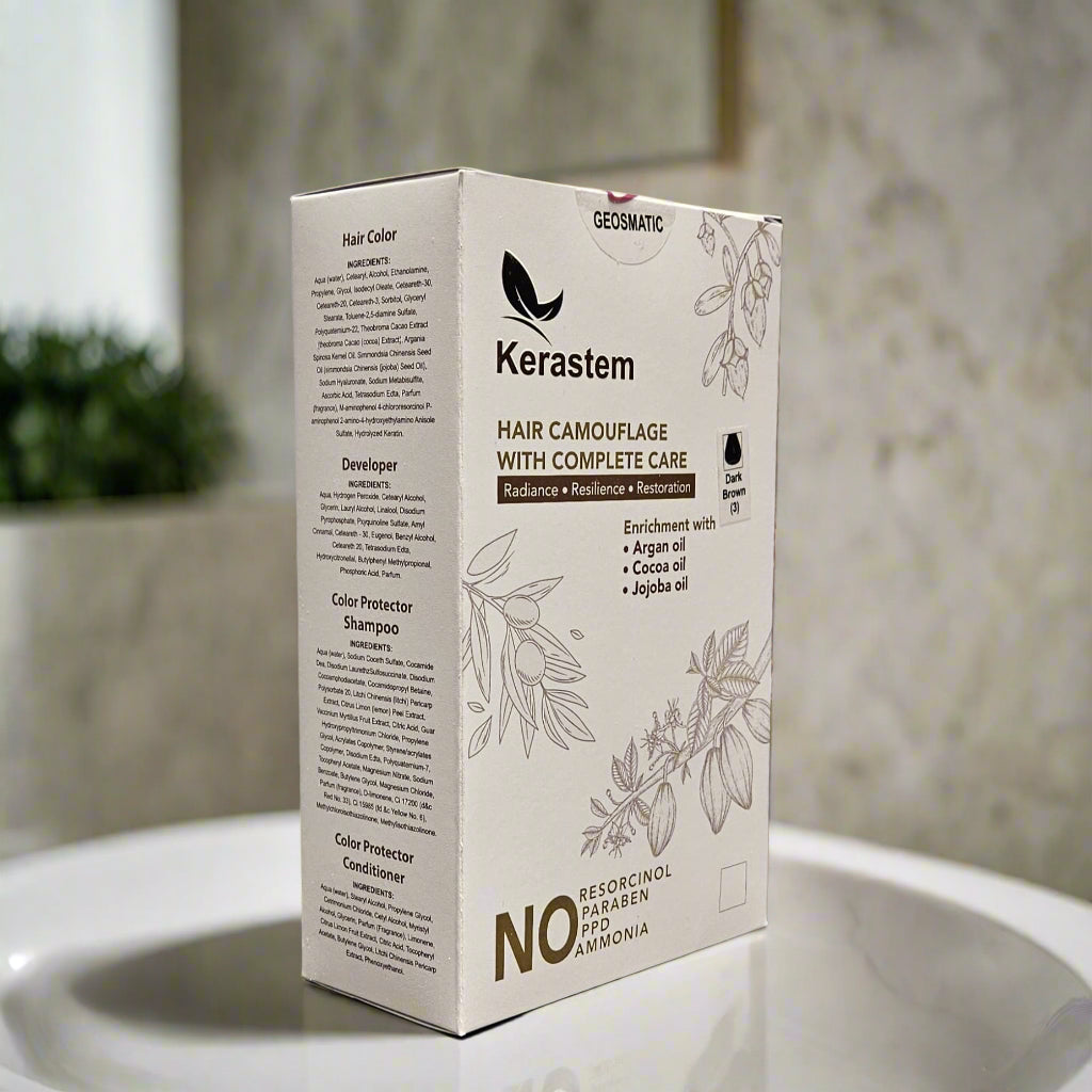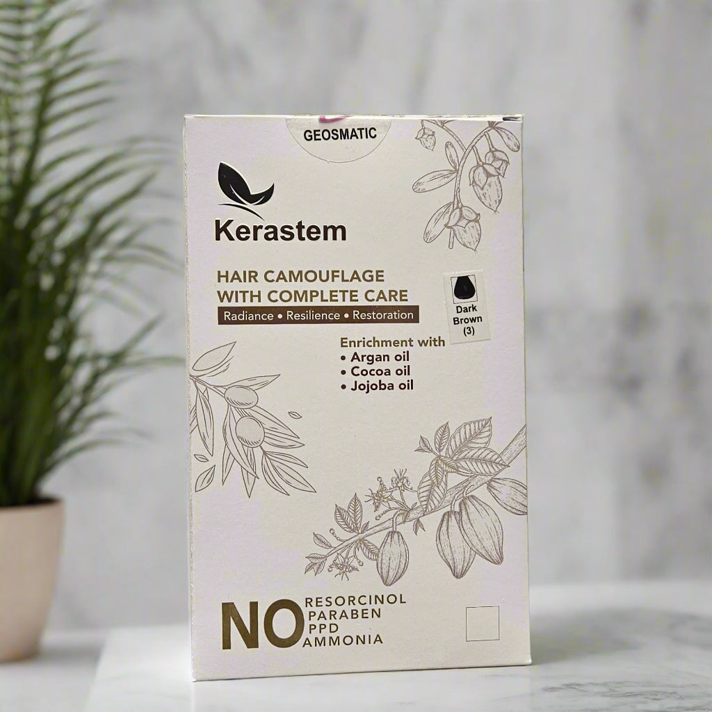 Experience the perfect blend of rich, natural-looking dark brown color and deep nourishment with Kerastem Hair Color 3 Dark Brown. Designed for 100% gray coverage, this advanced, ammonia-free formula delivers brilliant shine, long-lasting color, and superior scalp protection. Unlike traditional hair dyes, Kerastem is free from resorcinol, paraben, and para-phenylenediamine (PPD)—common irritants that can trigger allergies and scalp sensitivity.