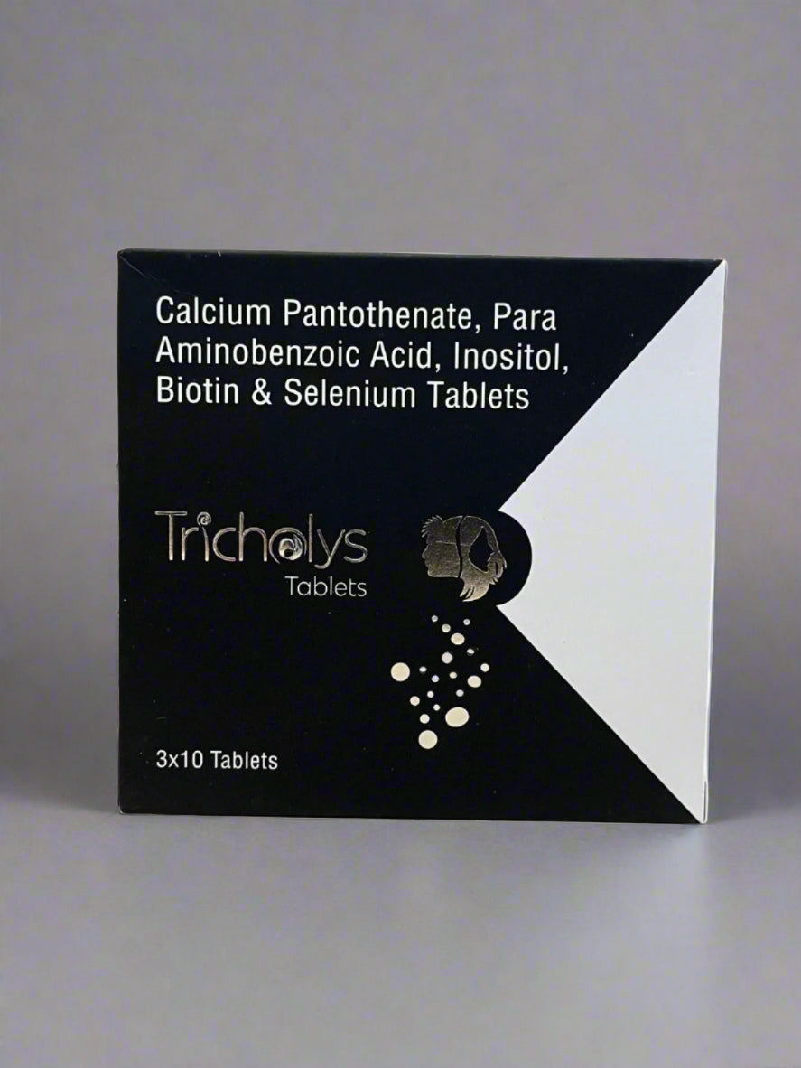 Tricholys Tablet is a scientifically formulated supplement designed to prevent premature greying of hair, restore natural hair color, and maintain overall hair health. Enriched with essential nutrients like Calcium Pantothenate, Para-Amino Benzoic Acid (PABA), Inositol, Selenium, and Biotin, this supplement works at the root level to support melanin production, strengthen hair strands, and ensure your hair looks youthful and vibrant.